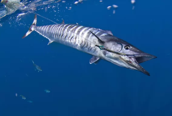Long and slender bodied, some specimens have been measured as long as 8+ft in length and nearly 200 lbs. Due to its similar body type and coloring, Wahoo is occasionally confused for Barracuda by the novice fisherman. However, Wahoo are typically larger and have comparatively less prominent scales and teeth.