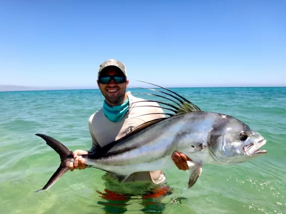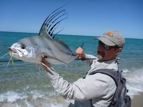 Even without their characteristic rooster comb, the Roosterfish has an impressive appearance. The body is a brilliant, shiny silver with a light aqua blue accent on its back and stark, striking dark stripes accenting both sides. You’ll definitely want to bring your camera because catching a Roosterfish makes for a great Photo op.