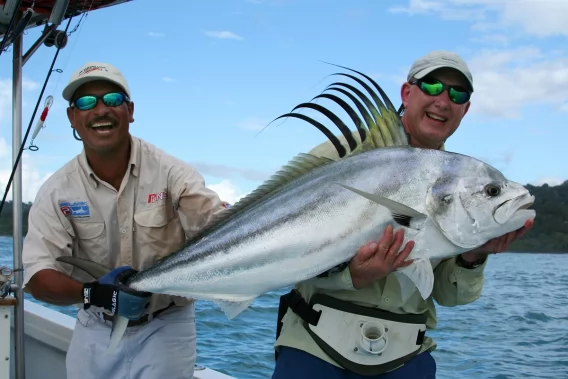 The Roosterfish is a fascinating and popular sport fish that many anglers target while fishing in Costa Rica. They are known for their distinctive dorsal fin which has seven long spines protruding from it that, when out of the water, stand nearly straight up and resemble a “rooster’s comb”.