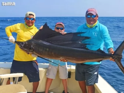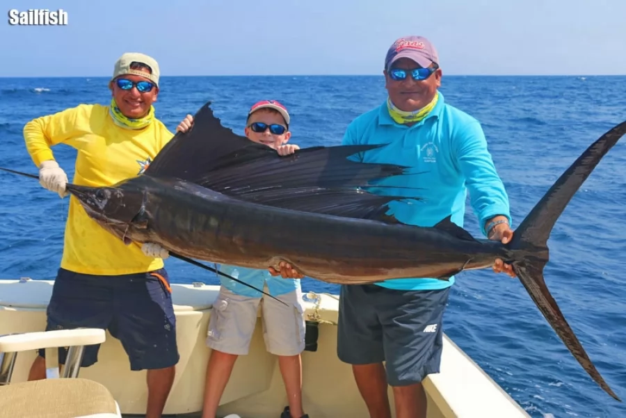 SAILFISH: Sailfish are present year-round at Piñas Bay; however, peak fishing is from June through August. Double hookups are common during this time, and most of the Sailfish released average between 90 and 120 pounds.