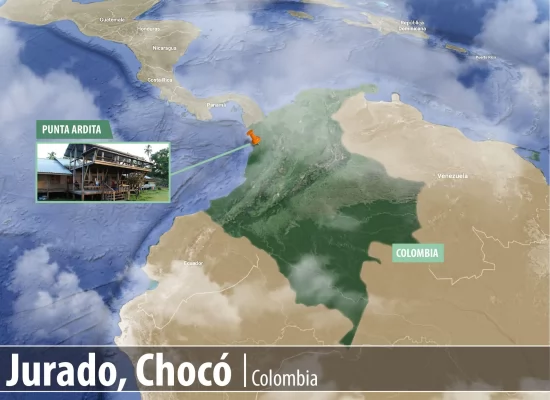 Bahía Solano sits in the most remote corner of the entire continental tropical eastern Pacific Coast. Surrounded by hundreds of km and no roads in any direction, Bahia Solano is a nature lovers paradise. During July - November, it is possible to see hundreds of humpback whales who migrate into the warm deep waters of Bahía Solano to mate and give birth. Utria National Park, the largest protected area in Colombia's Pacific Coast is located just 40 minutes from Bahia Solano. Tours to the park can be organized daily basis.